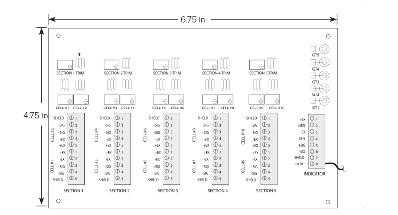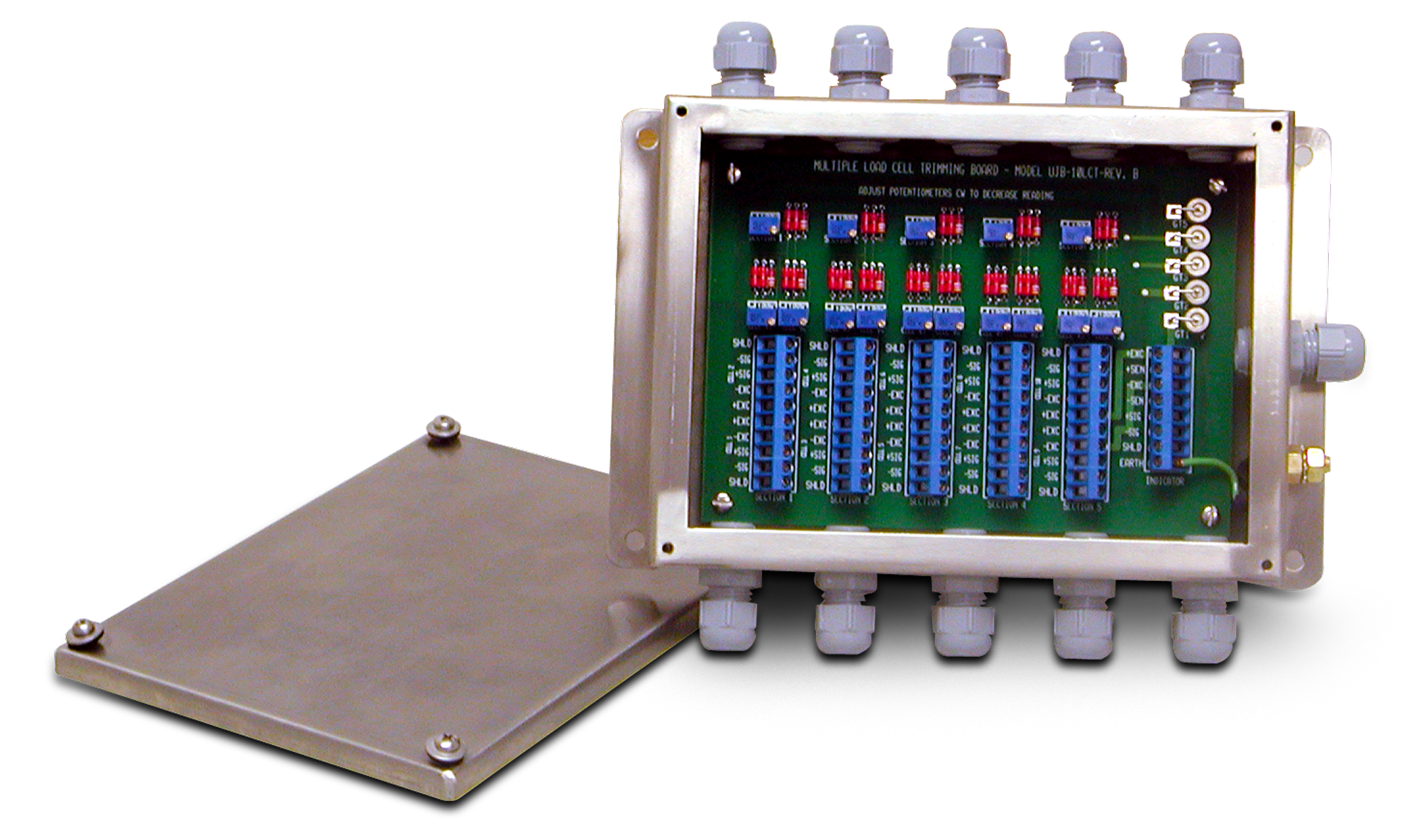 The JB1010T with transient protection provides easy access for trimming up to ten load cells per unit or conveniently adjust multiple cell modules by section.