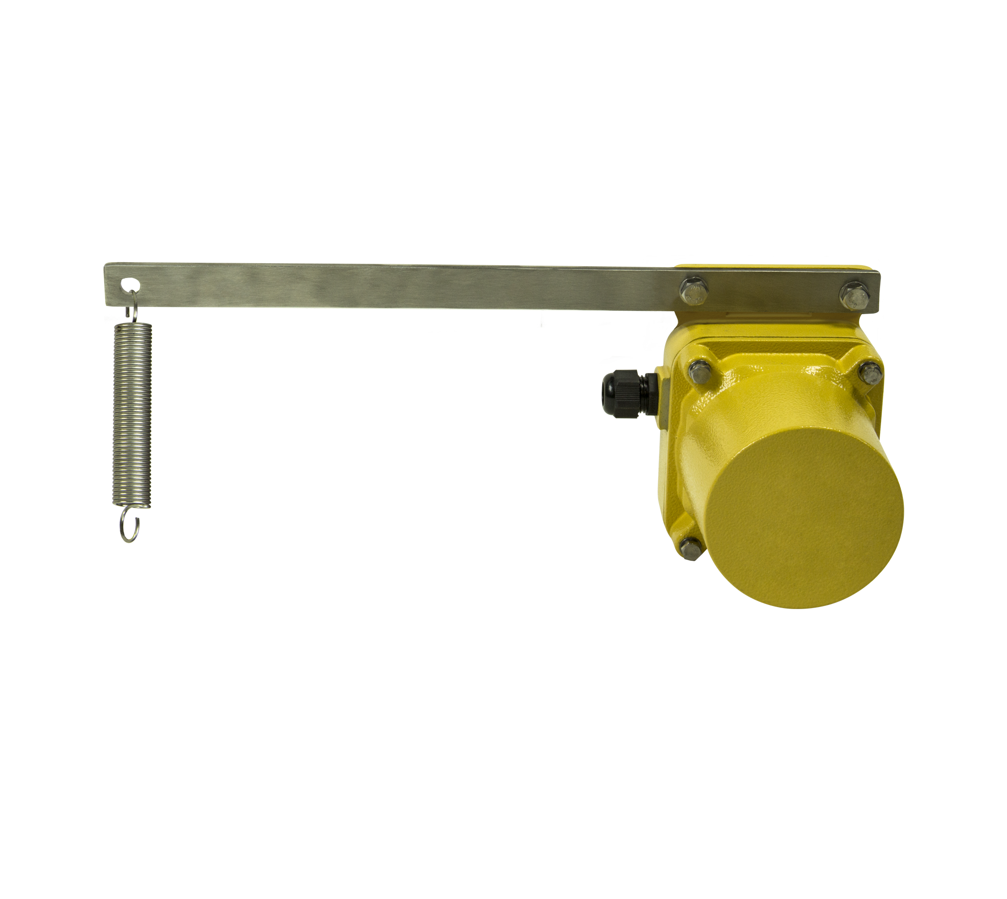The speed sensor monitors belt speed. It is directly coupled to a rotating shaft which drives a signal generator. The speed sensor submits an output signal at a frequency directly proportional to the shaft speed. It is typically installed on a non-driven pulley of a belt conveyor for detecting belt speed.