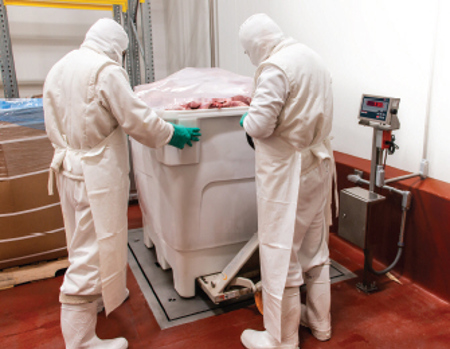 The pork is then transferred into 150-pound (70-kilogram) totes and weighed on a second pit-mounted RoughDeck QC-X floor scale for an additional measurement before entering cold storage. Differences in container capacity and fill level from the receiving room to the totes often result in weight changes. These loads, typically in the 2,200 to 3,300-pound range (1,000 to 1,500 kilograms), are essential for precise inventory tracking at this stage of the process.